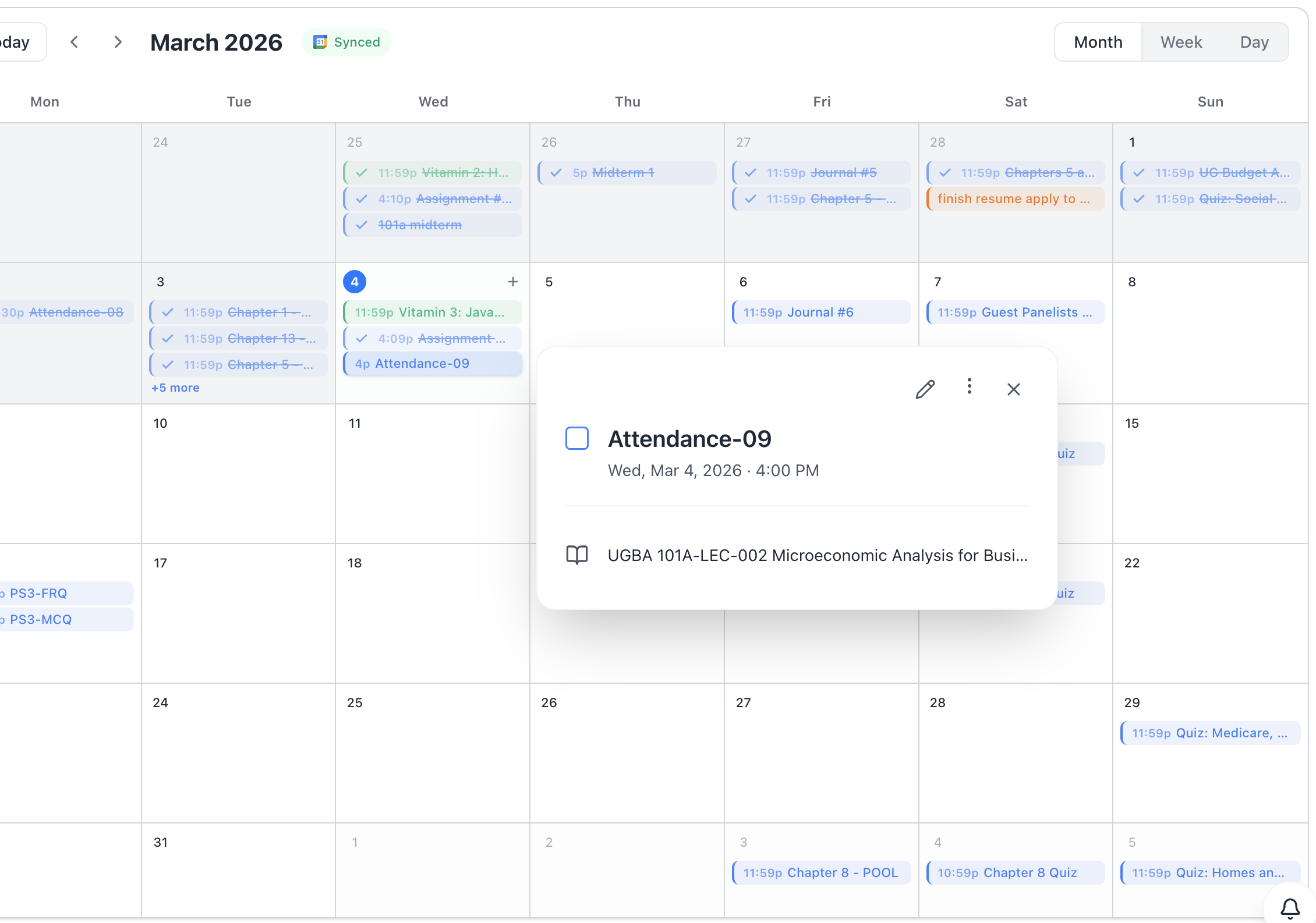 Having all my Canvas and Gradescope deadlines in one place is a game changer. I never miss an assignment anymore and the calendar view makes planning my week so much easier.