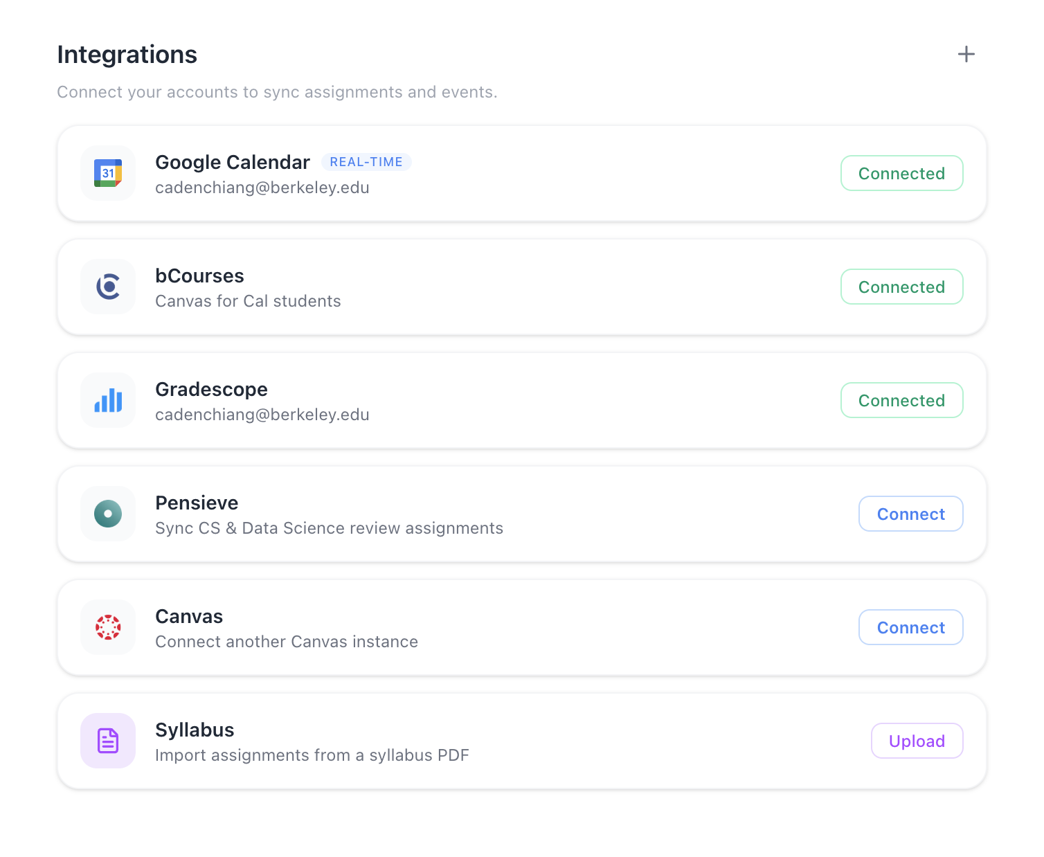 Auto-sync assignments from bCourses, Gradescope, and Pensive.